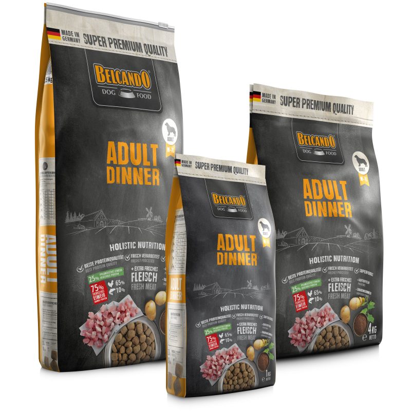 Een zorgvuldige selectie van de grondstoffen, veel mals pluimvee, gezonde aardappelen en koudgeperst druivenpittenmeel geven BELCANDO® ADULT DINNER de ideale voedingscombinatie voor de volwassen hond. Het beperkte gehalte van eiwitten en vet is aan de behoefte van honden met normale activiteit aangepast. Wordt de passende hoeveelheid toegediend dan blijft het lichaamsgewicht met passende verzadiging constant. Daarnaast zetten de grotere brokken aan tot kauwen.