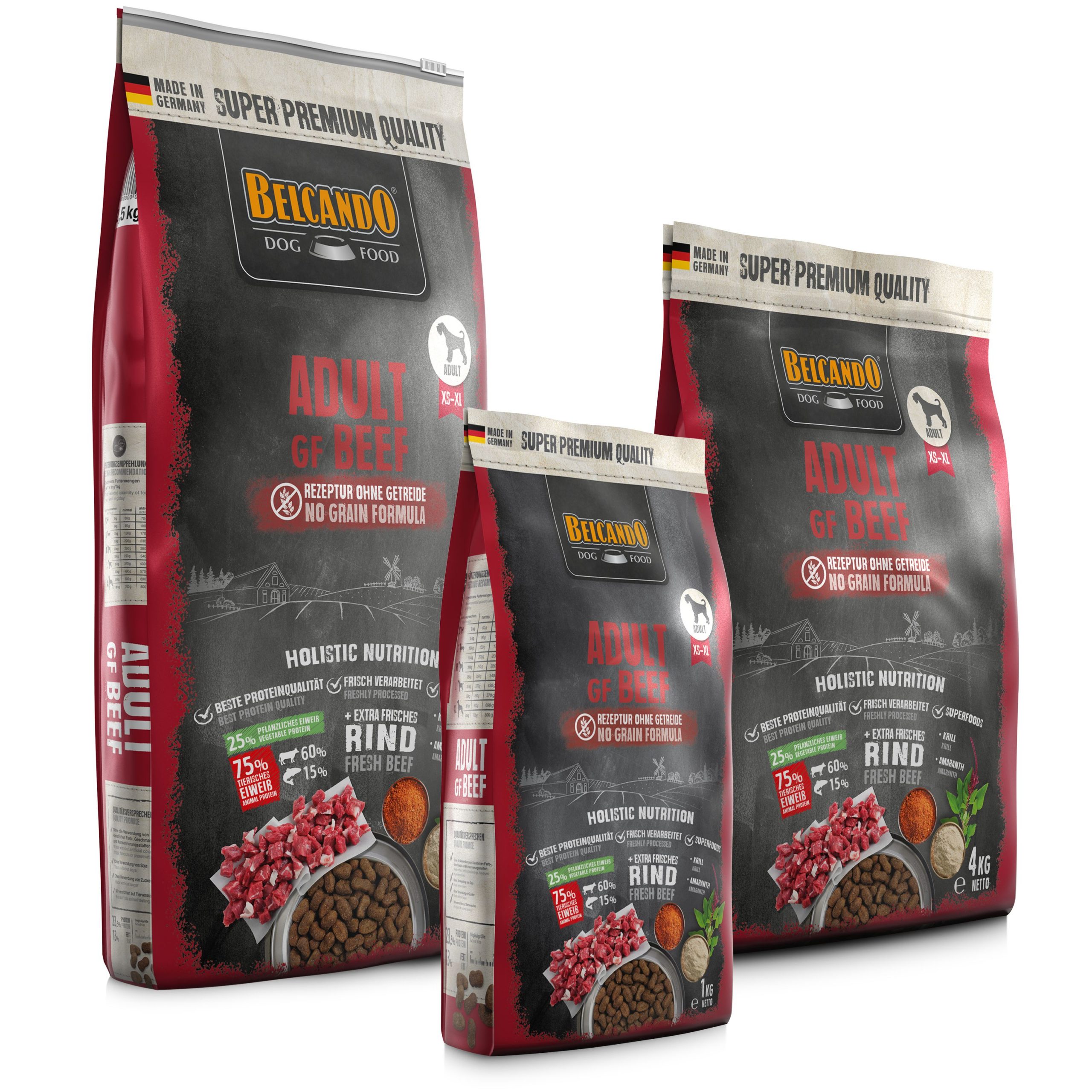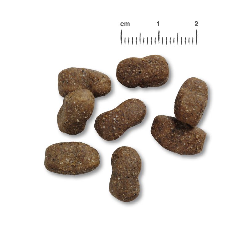 Samenstelling: Vers rundvlees (40 %); Amarant (18 %); Aardappelzetmeel; Rundeiwit, gedroogd (12,5 %); Erwtenbloem; Vismeel van zeevis (2,5 %); Zeezoöplankton, gemalen (Krill, 2,5 %); Bakkersgist, gedroogd; Johannesbroodpitmeel, gedroogd; Druivenpitexpeller; Dicalciumfosfaat; Gedroogde bietenpulp, ontsuikerd; Zalmolie; Distelolie; Gist, gehydrolyseerd; Chiazaad; Natriumchloride; Kaliumchloride; Kruiden, gedroogd (totaal: 0,2 %; Brandnetelblad, Gentiaanwortel, Duizendguldenkruid, Kamille, Venkel, Karwij, Maretak, Duizendblad, Braambladeren); Yucca schidigera