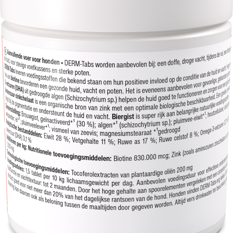 (Supplement: 830.000 mcg/kg overeenkomend met 3.000 mcg per 10 kg lichaamsgewicht van de hond wanneer de aanbevolen dosering wordt aangehouden) Biotine (vitamine H) is essentieel voor het lichaam voor de synthese van keratine, de basisstof voor huidcellen, haar en nagels. Een gebrek aan biotine uit zich in vroegtijdige vergrijzing, dof, droog haar, haarbreuk, haaruitval, secundaire ontstekingen met vervelling en jeuk. Gezonde honden worden voorzien van biotine dat in de dikke darm wordt geproduceerd. Bij honden met eerdere genoemde huid- en vachtproblemen geven supplementen met hoge concentraties biotine snel een verbetering.