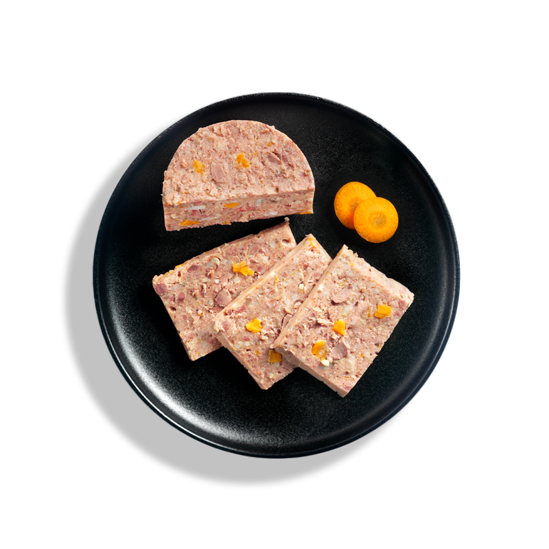 Samenstelling: Kippenvlees, -hart, -lever, -spiermaag (40 %); Eendenvlees, -hart (25 %); Kippen- en eendenbouillon (24,5 %); Gierst, gekookt (4 %); Wortels (4 %); Chiazaad (1 %); Mineralen (1 %); Distelolie (0,5 %)