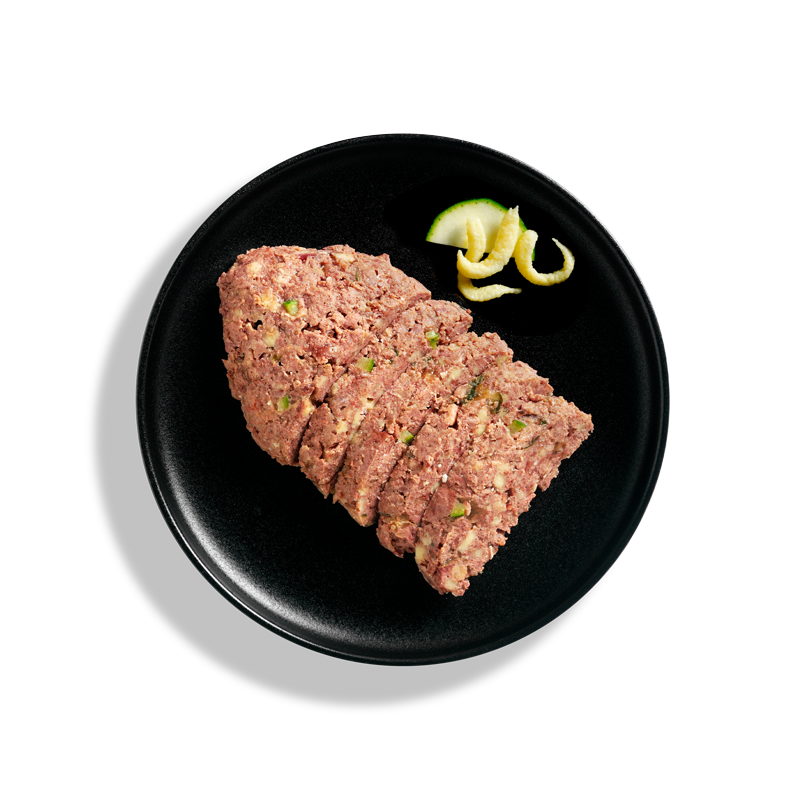 Rundvlees, hart, long, lever, strottenhoofd, pens (63 %); runderbouillon (28 %); spaetzle (4 %); courgette (4 %); saffloerolie (0,5 %); koolzure voederkalk (calciumcarbonaat) (0,5 %)