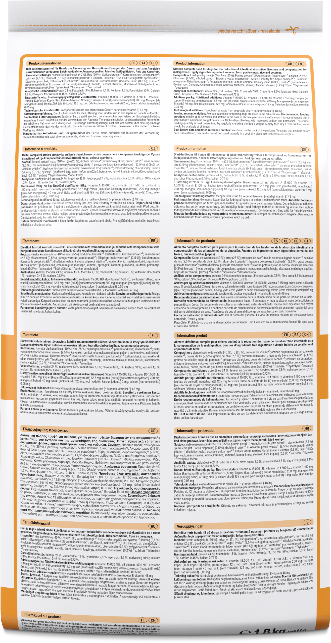 Samenstelling: Vers gevogeltevlees (40%); rijst (25%); gevogelte-eiwit*¹; aardappelzetmeel; gevogeltelever*²; lijnzaad (2,5%); chiazaad (2,5%); carobmeel*¹; biergist, geïnactiveerd*¹ (2,5 %); gevogeltevet; appeldraf*¹; dicalciumfosfaat; gedroogde bietenpulp*³; kaliumchloride; natriumchloride; cichorei-inuline (0,3 %); kruiden*¹ (brandnetelbladeren, gentiaanwortel, duizendguldenkruid, kamille, venkel, komijn, maretak, duizendblad, bramenbladeren) (0,2 %) *¹gedroogd *²gehydrolyseerd *³ontsuikerd