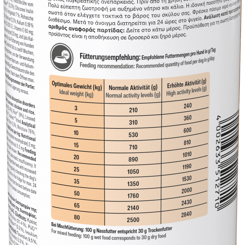 Samenstelling: Vers gevogeltevlees (40%); rijst (25%); gevogelte-eiwit*¹; aardappelzetmeel; gevogeltelever*²; lijnzaad (2,5%); chiazaad (2,5%); carobmeel*¹; biergist, geïnactiveerd*¹ (2,5 %); gevogeltevet; appeldraf*¹; dicalciumfosfaat; gedroogde bietenpulp*³; kaliumchloride; natriumchloride; cichorei-inuline (0,3 %); kruiden*¹ (brandnetelbladeren, gentiaanwortel, duizendguldenkruid, kamille, venkel, komijn, maretak, duizendblad, bramenbladeren) (0,2 %) *¹gedroogd *²gehydrolyseerd *³ontsuikerd