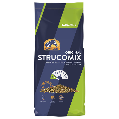 Paarden zijn van oorsprong steppedieren die vroeger, de hele dag door, grassen en kruiden konden uitzoeken om te eten. Dit is te zien aan hun verteringsstelsel met een kleine maag en sterk ontwikkelde dikke darm. Vandaag de dag eten paarden vaak sterk geconcentreerd krachtvoeder, relatief weinig hooi en bijna geen kruiden. Wat in feite tegennatuurlijk is. Cavalor® Strucomix Original is een volledig onderhoudsvoeder dat natuurlijke grondstoffen bevat zoals een paard die vroeger in alle vrijheid zelf kon vinden. Het bevat FIBER PLUS waarbij luzerne vezel zorgt voor een aanvoer van ruwe celstof die de darmflora stimuleert. YEAST PLUS en een uitgebreid gamma van kruiden, zoals tijm, look en oregano hebben op hun beurt een positief effect op vertering, weerstand en ademhaling. Cavalor® Strucomix Original kan ook gebruikt worden als vervanger van ruwvoeder (naast krachtvoeder) of het wordt gegeven als aanvulling naast krachtvoeder en ruwvoeder zodat uw paard alle gewenste kruiden ter beschikking krijgt.