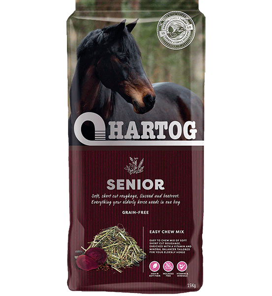 De Hartog Senior is een hoogwaardige en complete ruwvoer mix en is door de zachte structuur perfect voor oude paarden met gebitsproblemen. De Hartog Senior kan helpen om paarden met gebitsproblemen ook gezond en fit oud te laten worden!