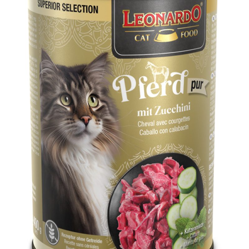 Leonardo natvoer Paard met courgette brengt uw viervoeters in beweging: veel hoogwaardig paardenvlees zorgt voor een heel bijzondere smaakbeleving in het voerbakje. Vooral voedingsgevoelige katten zijn dol op dit uiterst verteerbare menu. Sterke vleesbouillon en courgette zorgen voor een malse, sappige bite. De toegevoegde zalmolie met zijn meervoudig onverzadigde vetzuren geeft de vacht een zijdeachtige glans. Dit recept is zonder granen en suiker en heeft 1 dierlijke eiwitbron. Om het extra lekker te maken is er kattenkruid aan toegevoegd.