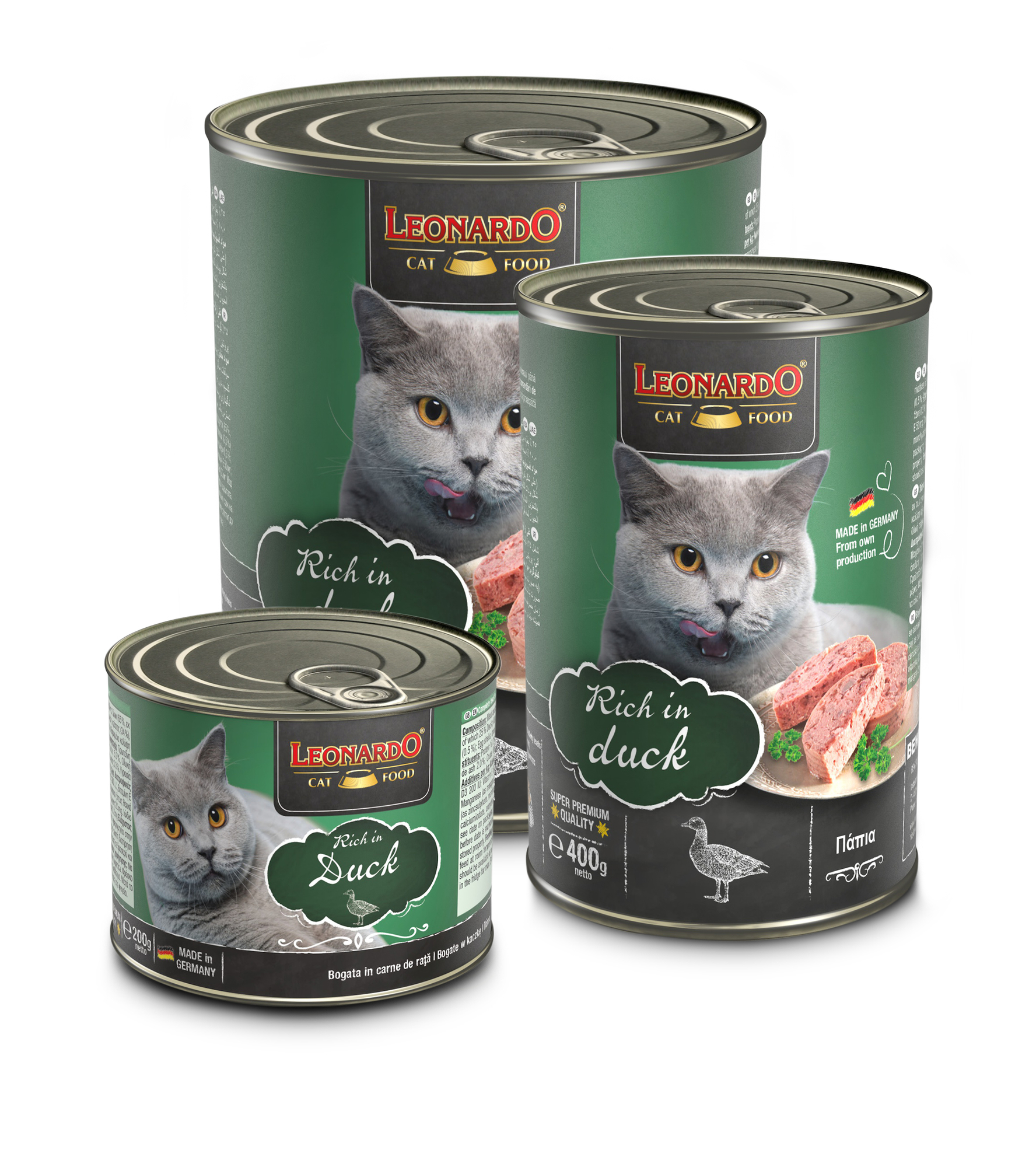 Leonardo blikjes natvoer zijn ook verkrijgbaar in de smaken: Rijk aan rundvlees, Rijk aan lever, Rijk aan pluimvee, Rijk aan konijn, Rijk aan zeevis, Kitten, Kalkoen met forel, Paard met courgette, Rund met wild & zoete aardappel, Kip met spinazie, Lam met gevogelte & pompoen, en Eend met kip & wortelen