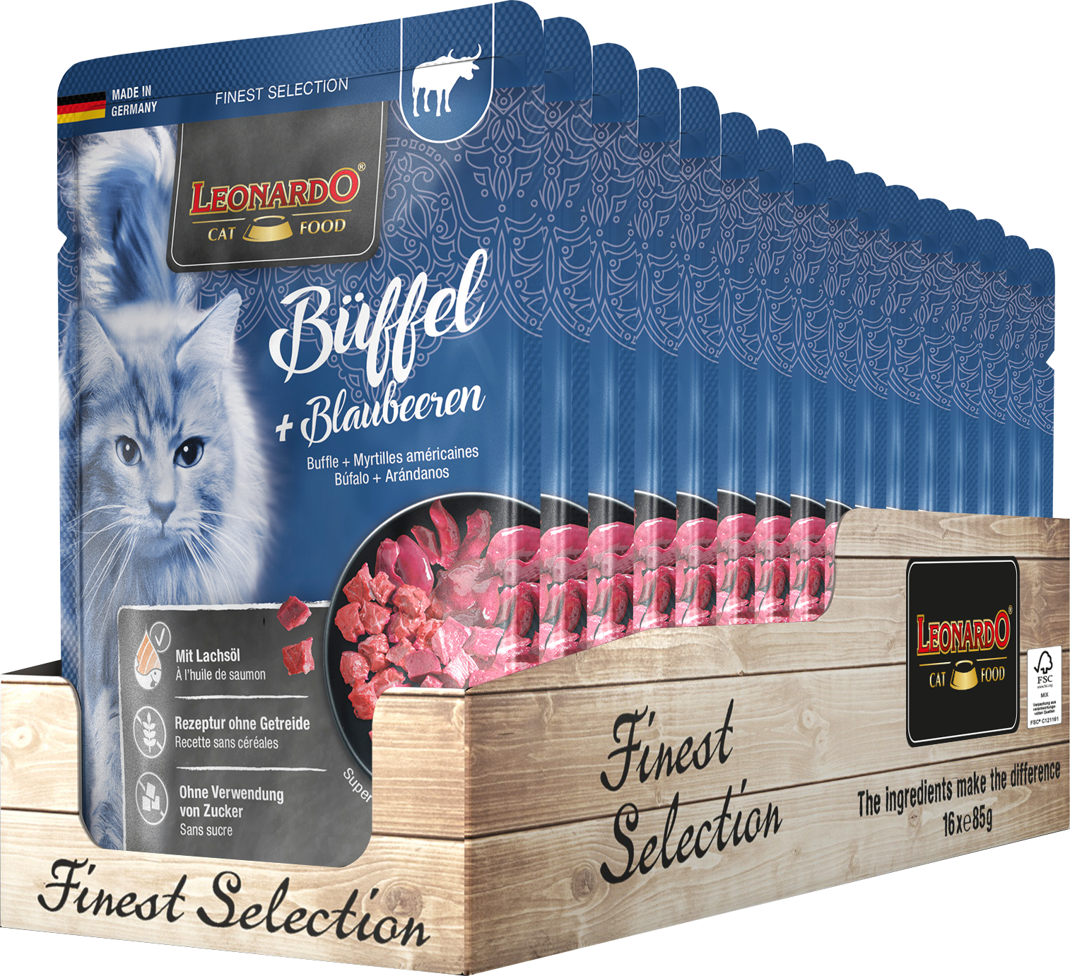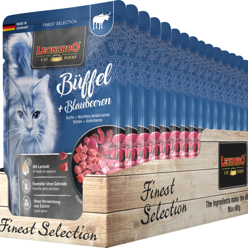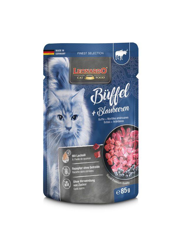 Samenstelling: Buffellong, -lever, -hart, -nier (Bubalus arnee) ( 30%); Kippenvlees, -lever, -hart ( 30%); Vleesbouillon ( 29,8%); Runderlong ( 6%); Bosbessen ( 3%); Eierschalen, gedroogd ( 0,5%); Mineralen ( 0,5%); Zalmolie ( 0,2%)