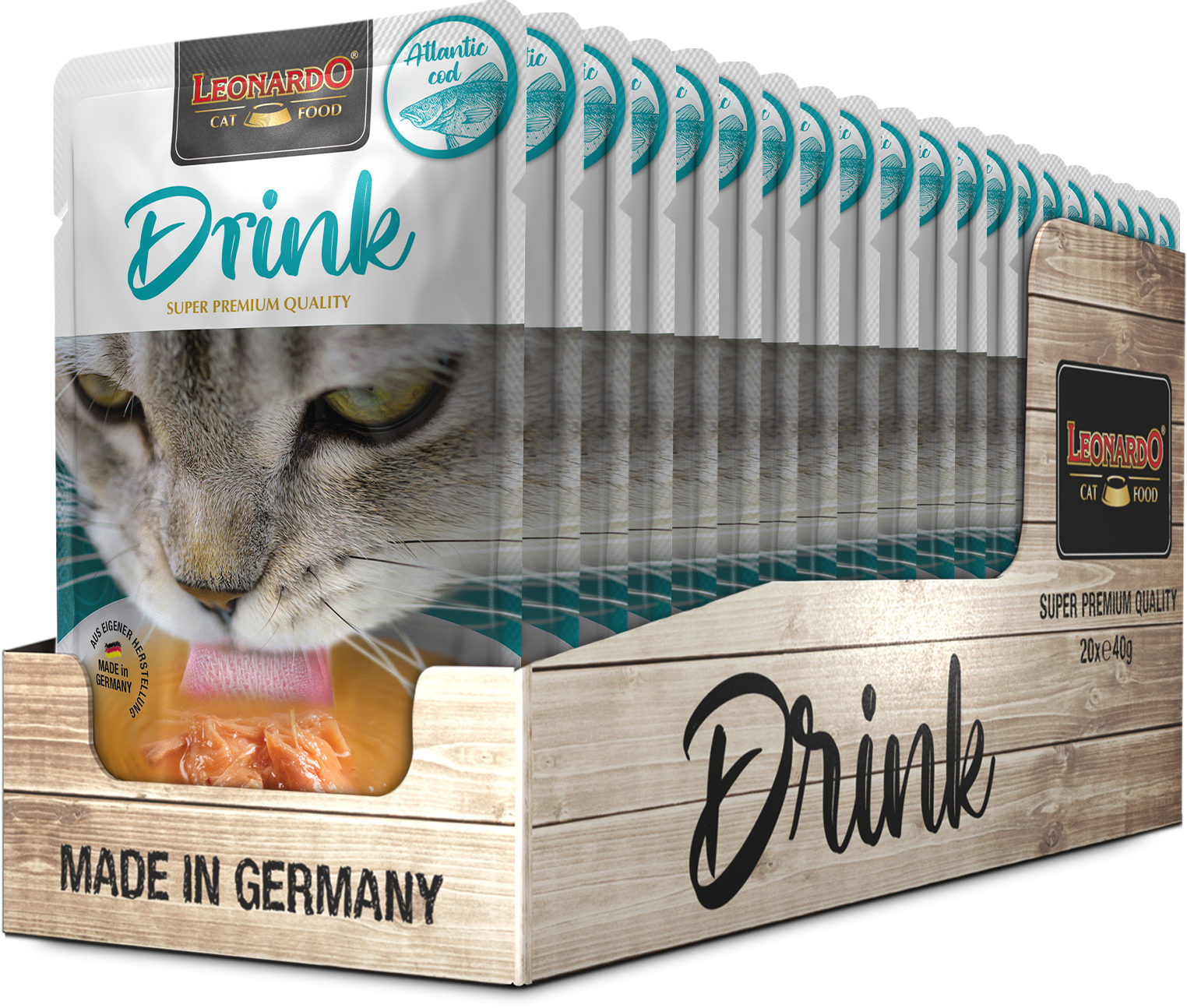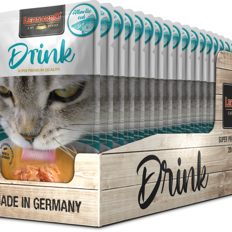 De smaak van de zee: Drinkt jouw kat te weinig? De LEONARDO Drink Atlantic cod, met zijn subtiele vissmaak, lokt je kat naar de drinkbak! Perfect als aanvulling op droogvoer, deze drank stimuleert het drinken en bevordert de gezondheid en vitaliteit van je kat. Voldoende hydratatie is cruciaal om de werking van de urinewegen te ondersteunen.