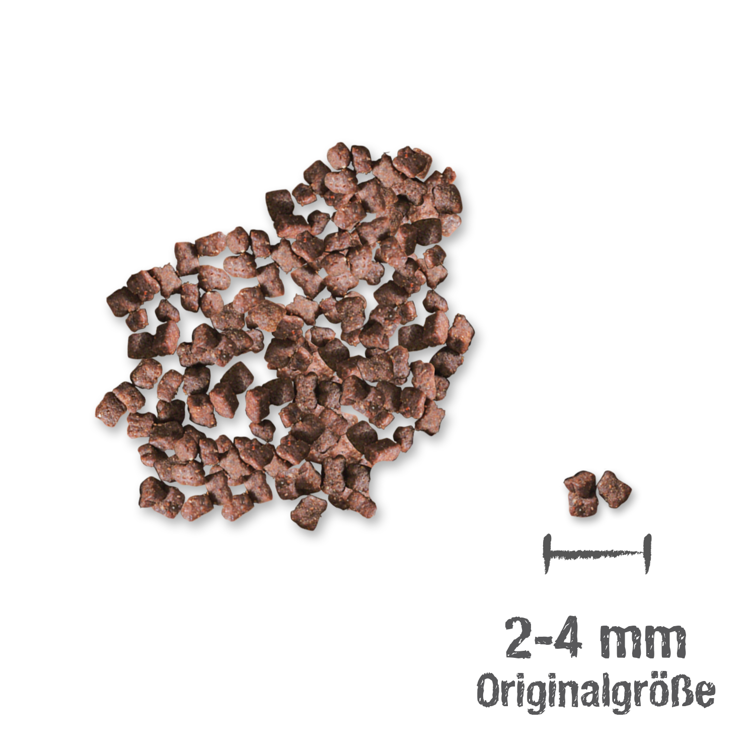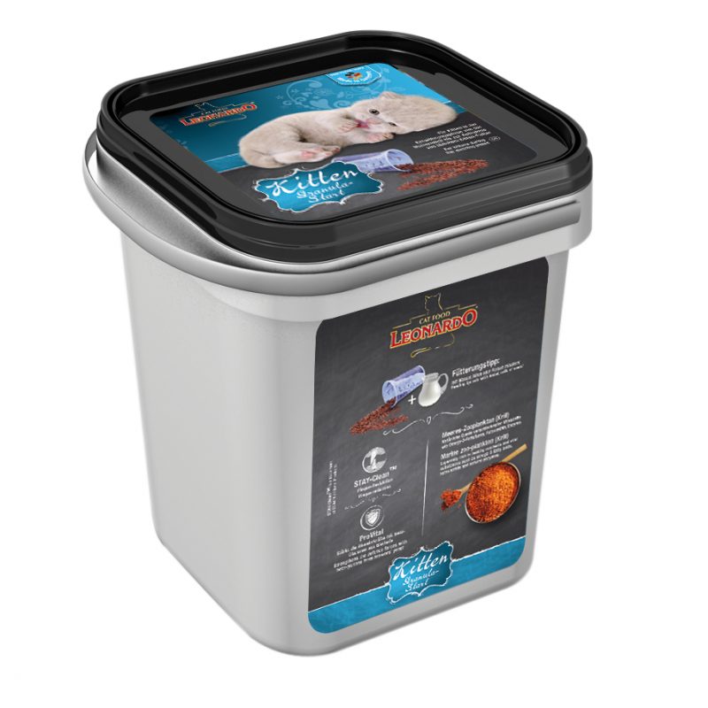 LEONARDO ® Kitten Granula start wordt in een speciaal proces “gegranuleerd” naar een specifieke groottefractie. Het resultaat is een solide voedingsstructuur met een zeer kleine deeltjesgrootte (0,2 – 0,4 mm). LEONARDO ® Kitten Granule start kan goed gemengd worden met de melk van de fok of water tot een mash of gemakkelijk gemengd met vlees.