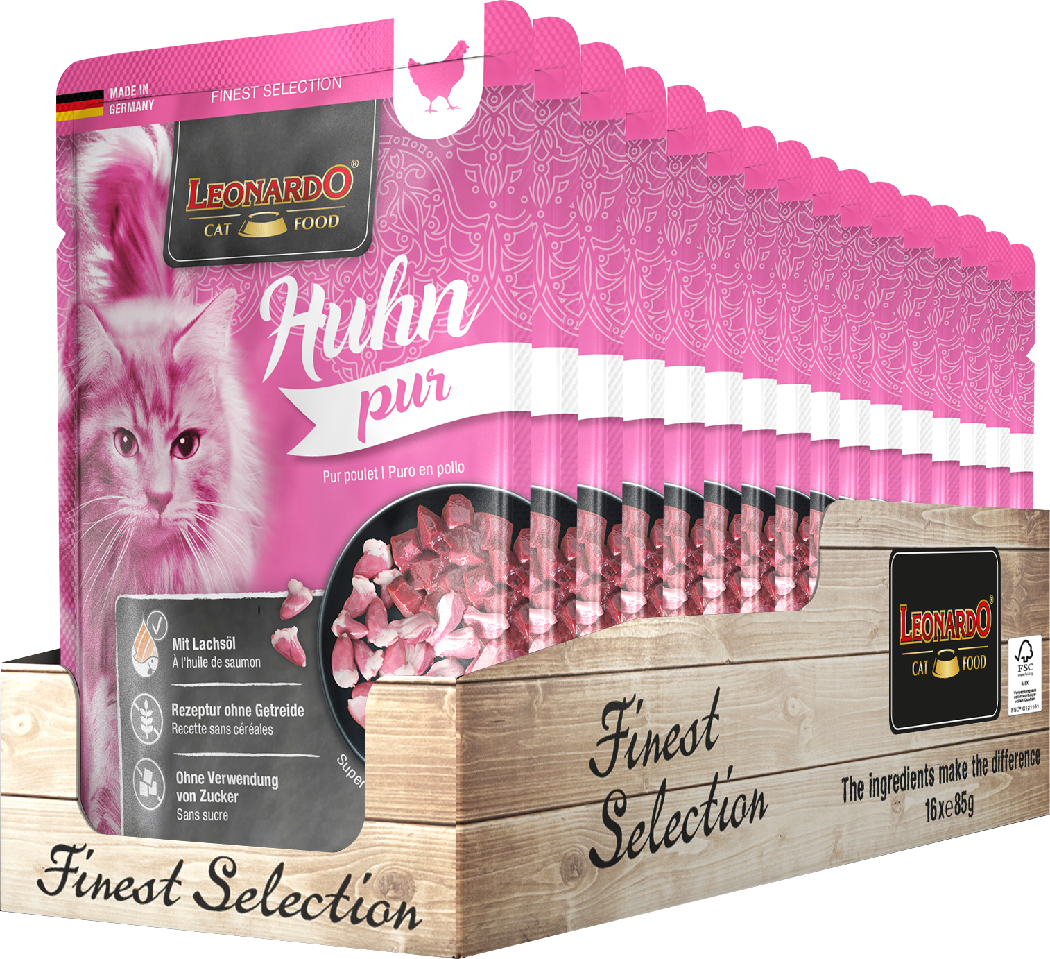 Samenstelling: Kippenvlees, -hart, -lever, -spiermaag (70 %); Kippenbouillon (28,8 %); Eierschalen, gedroogd (0,5 %); Mineralen (0,5 %); Zalmolie (0,2 %)