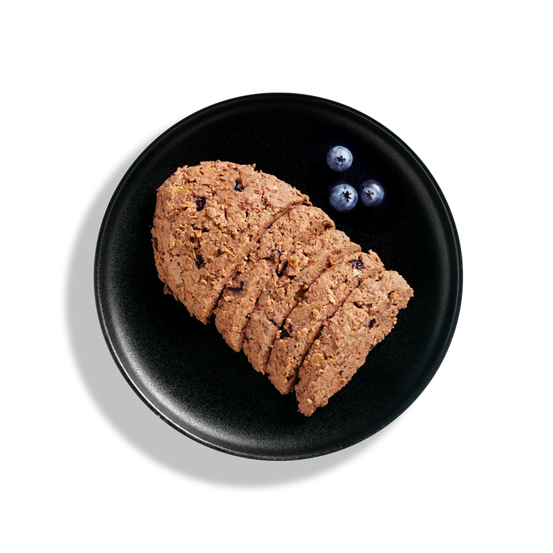 Samenstelling: Pluimveehart, -lever, -maag (37 %); Wildvlees (30 %); Bouillon (29,8 %); Bosbessen (2 %); Eierschalen, gedroogd (0,5 %); Mineralen (0,5 %); Zalmolie (0,2 %)